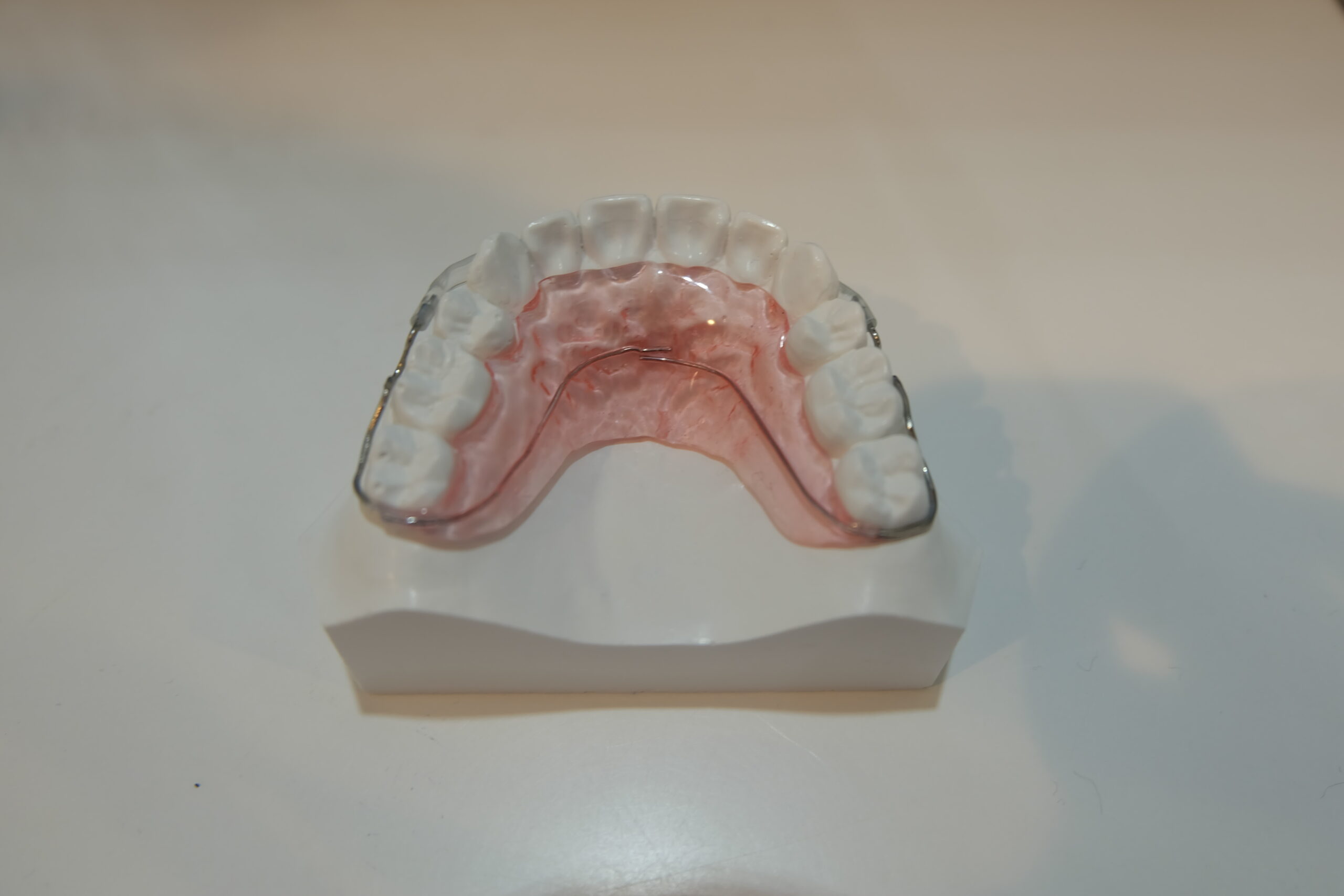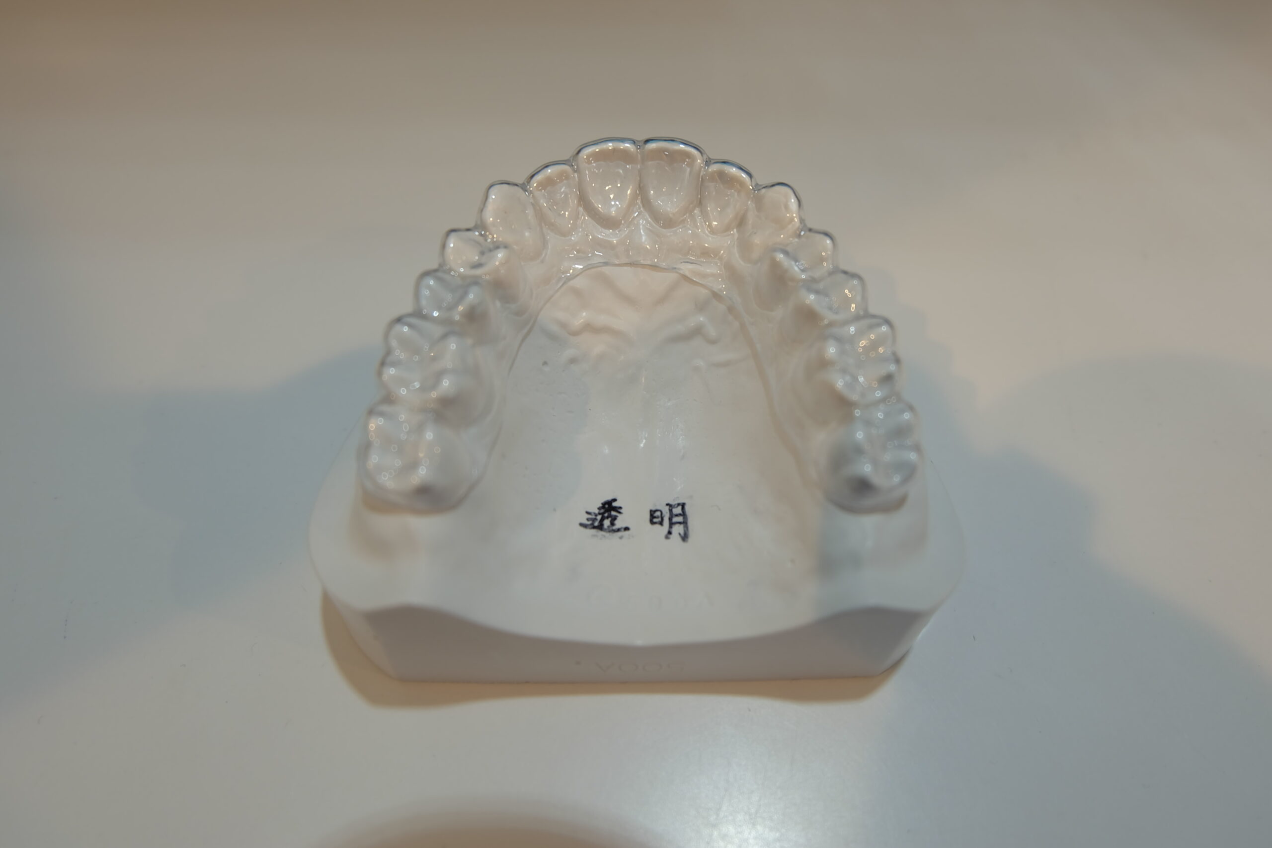 これは矯正治療が終了した人が後戻りを防ぐために歯を固定安定させるための装置となっています。既製のフィルムを模型に圧接して作るのですが、半透明と不透明のタイプがあり不透明のタイプの圧接が前歯が薄くなりやすく慣れるまで苦労しました。作ってから衛生士が装置setを行うので最初は、患者さんとのコミニケーションに自信がなかったのですが自分のリテーナーを作って同じ立場になってみることで喋りづらかったり違和感を患者さんと共有できたので次第に慣れていきました。