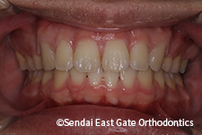 | 治療内容の詳細 | 著しく上顎前歯の前方突出と叢生が存在しました。全体的に歯根が短い傾向が存在したため、矯正治療による歯根の短根化のリスクが懸念されました。歯根吸収が最小限となるように治療期間が長くなることには理解をしていただき、弱い矯正力での治療を行ないました。 | ||