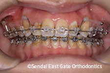 小臼歯部より後方は金属色のセルフライゲーションブラケット装置(ミニクリッピー)